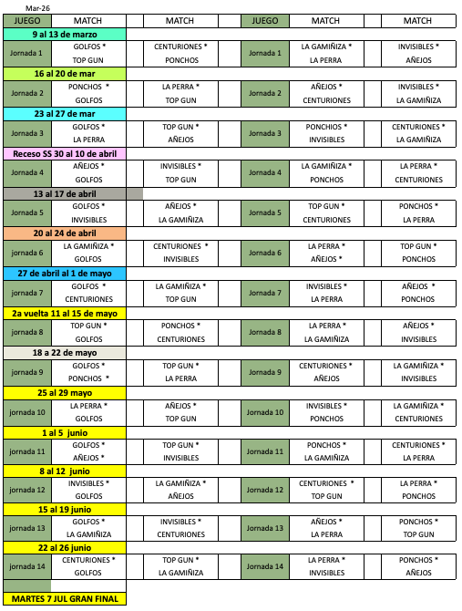 Convocatoria Reglamento de Handicaps Roles de Juego Match Maker Match Semana 01 Match Semana 02 Match Semana 03 Resultados De La Jornada 1 Por Equipos Por Jugadores Equipos Galería Reflexiones ROLES DE JUEGO EDICIÓN PRIMAVERANO 2026